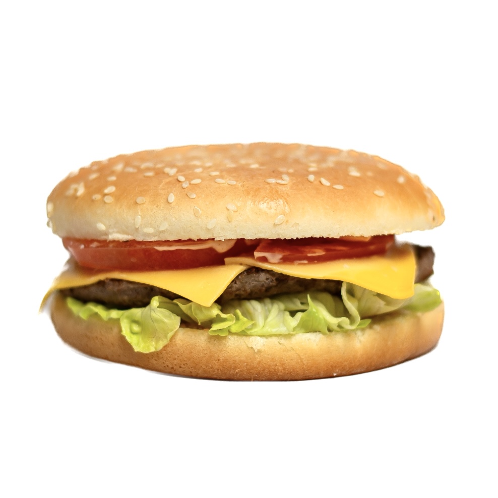 Состав: булочка, говяжья котлета, св. помидор, салат, сыр “Чеддер”, салат, соус “Бургер”.